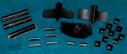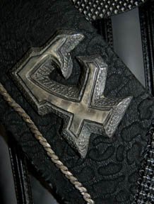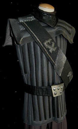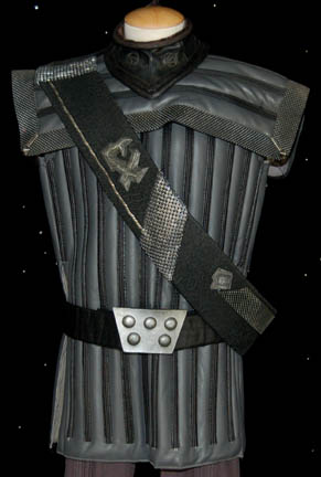 Description: A lot of Klingon costume items featured throughout Star Trek: Deep Space Nine. This lot consists of a gray, leather/vinyl pleated, jacket featuring textured, vertical stripes, a dark-gray, shoulder “armor” piece with diamond-shaped rubber detail, metal accents and horizontal, black stripes above them. A long, sleeveless, gray undergarment with large vertical pleats, one of the trademark Klingon trapezoidal belts with the five raised dots on them, a black vinyl, baldric sash featuring similar, diamond-shaped rubber accents, a resin and a gorgeous metal iconographic symbol, metal chainmail, and a Velcro closure on the bottom. A black leather gorget featuring black, rubber piping and Klingon iconographic symbols, two pair of black, leather gloves with trimmed fingers and “claws” on the ends, a bag of metal, plastic, and rubber costume accessories. Four black, faux-fur sleeves featuring gold-colored thread, and gray, overall-style trousers with stirrups for the feet, and black, vinyl spats. Multiple labels denote use by many actors. 6146