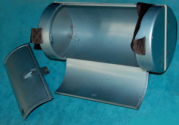Description: A prop carrying case similar to those featured variously throughout 24th century, Star Trek, episodic television. This item is a blue-green, cylindrical carrying case, white and black detail, a black nylon strap and two doors that open on hinges. Unfortunately, one of the doors has broken off the hinge but is easily repaired. The item has a length of approx. 16 inches and a diameter of approx. 8 inches.