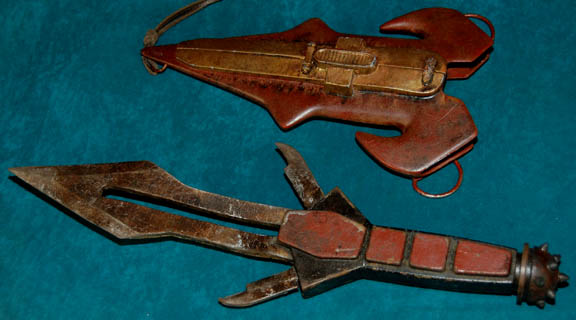 Description: A prop Klingon weapon featured in the Star Trek: Enterprise episode “The Augments”; wherein “Arik Soong” (Brent Spiner) and his band of augmented humans try to start a war with the Klingons. This weapon is the D’k Tahg, it is the traditional knife of the Klingon warrior and probably one of the most recognizable weapons in the Star Trek pantheon; it is a reinforced rubber knife with a single, straight primary blade and two little blades radiating out diagonally from the sides. The handle is black rubber with brownish-red accents; from an undesignated Klingon house, has a rubber “spiked” ball on the butt end, and features a matching molded-plastic sheath for the knife with gold-colored detail, two metal hoops to attach it to a belt and a brown, leather strap to tie it with. The knife has minor fading and is distressed for effect as are all Klingon accoutrements. The item measures approx. 17 X 6 X 1.5 inches.