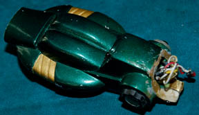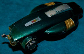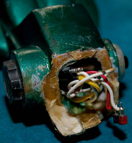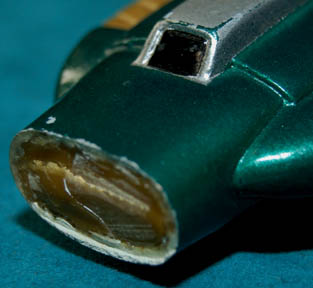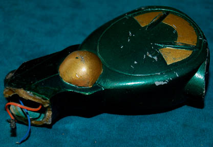 Description: A Vulcan energy pistol like those featured in the Star Trek: Deep Space Nine episode “The Magnificent Ferengi”. The item is comprised of molded resin painted metallic green with gold and silver painted accents. The item features a bank of red, green, and yellow LEDs across the top that are powered by a single 3volt CR2025 sized battery. However, the item is broken in half and the electronics are not intact. Repairs appear to have been performed on the item previously as dried glue residue is still present. The item measures approx. 8 X 2.25 inches, and to date, no other Vulcan energy pistol has been located.