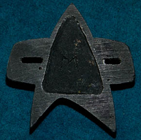 Description: A molded resin Starfleet combadge made in the style first appearing in Star Trek VII: Generations and in the following films, then going on to appear in Star Trek: Deep Space Nine and Voyager. The item is painted metallic gold and silver and the reverse is hollowed out to allow a cavity for a Velcro placement which is missing. The reverse is also inscribed ‘13’. The item measures approx. 2 X 2 inches.