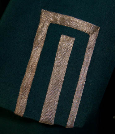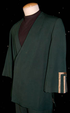 Description: A green three piece costume featured in Star Trek IV: The Voyage Home for wear by a worker at the Federation Security Council. The costume is green trousers and a matching Class-C jacket wrap style top like those featured in Star Trek I: The Motion Picture, but altered to include gold trim on the sleeve cuffs. The costume features a black dickie and a sewn in Western Costume Co. tag. The shoulders feature remaining threads from removed items.