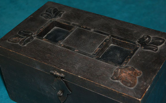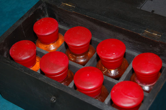 Description: A set of prop items in its case featured in the Star Trek: Enterprise episode "Civilization"; wherein the “Enterprise NX-01” crew finds an earth-like planet with a large population, but that is dying from an unchecked illness. These items consist of eight, identical glass bottles filled with wax tops, and an orange fluid that is supposed to be the vaccine to the “Teplan Blight”. All eight bottles fit into a varnished wood box with metal, floral accents and a metal latch. The bottles have an approx. height of five inches and a diameter of 2; the case itself measures approx. 11 X 6.5 X 6 inches.