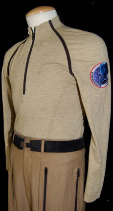 Description: STAR TREK: ENT “LIEUTENANT REED DESERT UNIFORM” FROM “THE BREACH” A costume featured in the Star Trek: Enterprise episode “The Breach”; wherein the “Enterprise NX-01” rescues three Denobulan scientists from a xenophobic government and “Dr. Phlox” (John Billingsley) deals with a patient who will not accept treatment from him because of his species. This costume is for wear by Dominic Keating in the role of the “Enterprise NX-01” Armory Officer, “Lieutenant Malcolm Reed”, and is an Earth Starfleet desert uniform consisting of a long-sleeved, tan shirt featuring thin, black stripes, black piping, a half zip down the front, an “Enterprise NX-01” patch on the left shoulder, and pips denoting the rank of “Lieutenant” on the right side of the collar. Also included are brown trousers featuring five functional pockets, zip and Velcro, ankle cuff adjustment, a black leather belt, and black suede climbing shoes. A sewn in tag reads ‘Enterprise, Dominic Keating, #47’ and the costumer’s tag reads ‘Reed, Dominic Keating, Desert shirt’.