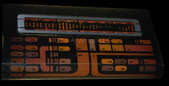 Description: A lot of items featured in various episodes of Star Trek: Voyager including “Drive”; wherein “Tom Paris” (Robert Duncan McNeill) enters the “Delta Flyer” in a goodwill interstellar race but finds it sabotaged by someone who wants to prevent such sentiments. This lot includes three LCARS (Library Computer Access and Retrieval System) panels; rectangular pieces of smoked acrylic, curved on the ends, featuring graphical applications adhered to the reverse of various shapes and colored “controls” labeled with letters and numbers, and a rounded, rectangular piece cut out of the top for another LCARS panel. One of such panels features silver detail, its own graphical application of two ascending lines of numbers with a wavelength graphic between them. Included are four of the seat back head rests also featured in various scenes on the “Delta Flyer”; an orange frame, metal inset and detail, two notched poles that attach to the seat to adjust the height, an indented rod shaped neck rest, a rectangular, mauve-colored cushion, three banks of multi-colored blinking lights on the reverse, and an activator switch towards the bottom on the left. The lights on all four items work but the activator switch on one of them needs to be resoldered. Beneath the cushion is the circuitry involved with the blinking lights, that runs on four nine-volt batteries. The LCARS panels measure approx. 17 X 9 X 2 inches and the seat back measures approx.20 X 15 X 10 inches.