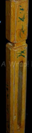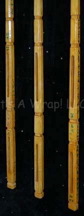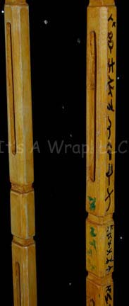 Description: A prop item lot featured in the Star Trek: Voyager episode “Favorite Son”; wherein “Harry Kim”( Garrett Wang) finds that he is originally a member of a Delta Quadrant race until evidence starts to come in of a conspiracy against him. This lot consists of four, lightly-varnished, brown staves featuring beveled corners, long, oval-shaped, indentions, painted on alien iconographic lettering, and beveled corners. The items measure approx. 60 X 2 X 1.5 inches.