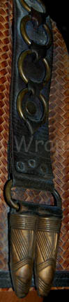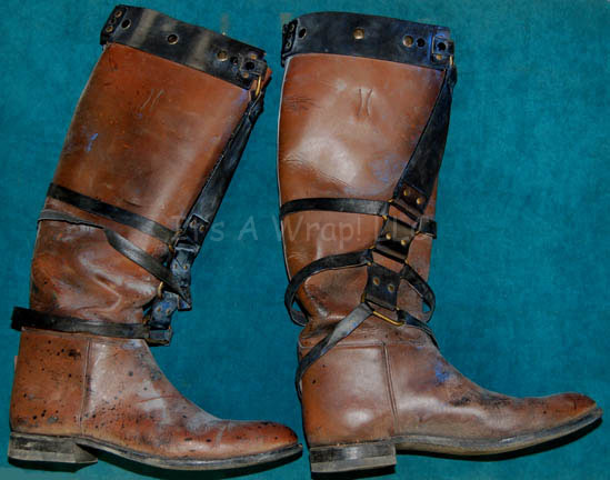 Description: A costume featured in the Star Trek: Enterprise episode “The Xindi”, wherein we catch our first glance of a Xindi in a trillium mining planet on the edge of the Delphic Expanse. The costume is that of one of the guards in the mining facility and is a brown, leather, overall-style trousers with stirrups for the feet, a brown leather long sleeved shirt, a heavy-duty woven tunic over the shirt with linked leather, metal belts and plastic accents that are distressed to look worn and exposed to mining conditions. Also included are a pair of matching, knee-high brown vinyl boots with black suede and gold-colored metal accents, and the Mine Guard’s weapon; a rubber cast, copper-colored phase carbine distressed in the same way. A sewn in ‘Enterprise’ tag either has had the name wear off or it never had one but a costumer’s tag reads ‘#053, Derek Mears’.
