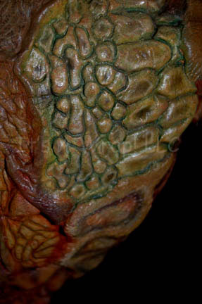 Description: A special effects make up mask created for the Star Trek: Voyager episode “Phage” or “Faces” where it may have been recreated or reused. The item is a molded foam rubber mask fashioned and painted to represent the mottled mess of a Vidiian head made up of scavenged alien flesh as a symptom of the degenerative plague in their alien society named ‘the phage’. The mask covers the entire head with holes for the mouth and eyes, in those places and around the edges of the neckline the mask is dry and some flaking and cracking has occurred. The mask will continue to break down over time but for now it is in otherwise intact condition and retains its appeal.