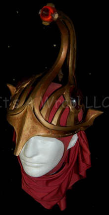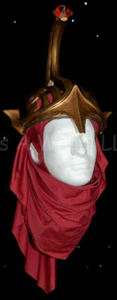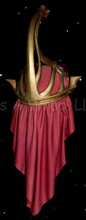 Description: A lot of two head pieces featured in Star Trek III: The Search for Spock worn by Vulcan Fal-Tor –Pan Ceremony attendees. One item is the head dress of a Vulcan ceremonial guard from comprised of a red fabric skullcap mounted inside a gold painted resin frame that features Vulcan ‘gems’ on the left and right with iconography painted onto them, and a larger ‘cut gem’ embedded into the horn on top. The item also features covering with openings for the famous Vulcan pointed ears and ties under the chin. The other head piece is a head band for a Vulcan gong striker. The item is rust colored with gold colored trim, a triangular ‘gem’ in the forehead with iconography painted on it, and a bow styled compliment for the back of the head. These items complete costumes that were sold in previous auctions.