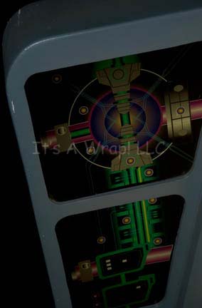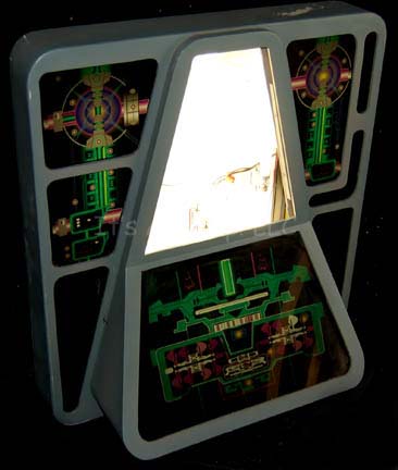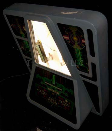 Description: A large set piece made to appear as a computer console featured in various episodes of Star Trek: Deep Space Nine. The item is a fashioned wood light box with internally mounted lights that activate when the type-B three prong plug is fitted into a standard American wall outlet (the plug has been replaced). The lights backlight the translucent acrylic panels mounted in front of them to reveal the Dominion style interfaces in front. One panel has been removed and a comparable one has been added to the lot, but not placed into the light box. The item measures approx. 33.5 X 36.5 X 14 inches. A degree of adhesive tape residue is present on the top of the item.