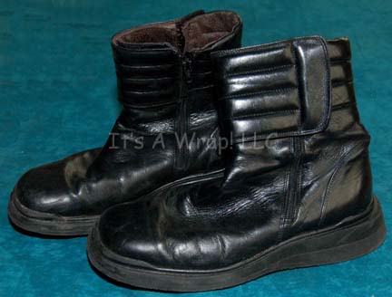 Description: A costume featured variously throughout Star Trek: Enterprise. This costume is a standard 22nd century Earth Starfleet uniform consisting of a full-length, long-sleeved, blue jumpsuit with seven functional, zipped pockets, Operations Red division strip, zipper/Velcro cuff adjustment for the wrists and ankles, Enterprise patch on the left shoulder, two rectangular pips denoting the rank of lieutenant just below the right shoulder, a black, sleeveless undershirt, and a pair of black, leather, Enterprise-style Starfleet ankle boots. A sewn in tag reads ‘Enterprise, Dominic Keating, Season 4 #1’.