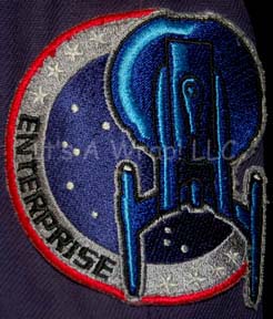 Description: A costume featured variously throughout Star Trek: Enterprise. This costume is a standard 22nd century Earth Starfleet uniform consisting of a full-length, long-sleeved, blue jumpsuit with seven functional, zipped pockets, Operations Red division strip, zipper/Velcro cuff adjustment for the wrists and ankles, Enterprise patch on the left shoulder, and a black, long-sleeved undershirt. A sewn in tag in each garment reads ‘Enterprise, Dawn Deninger’.