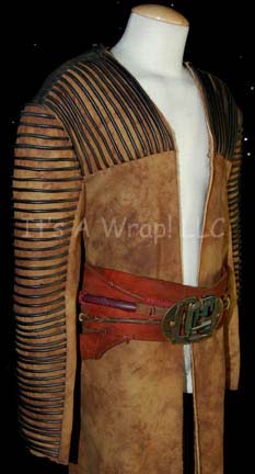 Description: A costume featured in the Star Trek: Enterprise episode “Affliction”; wherein “Dr. Phlox” (John Billingsley) is kidnapped by the Klingons to find a cure for the mutagenic virus that was spreading through the Klingon Empire. This costume is for wear by John Schuck in the role of the Klingon doctor “Antaak” who assists “Dr. Phlox” in finding a cure for the mutagenic virus; it is a long-sleeved, full-length, brown suede robe featuring black, raised leather piping along the shoulders and down the sleeves. A wide, rust-colored, leather belt featuring further, coiled leather cord, several metal and brass-colored buckles tied together with leather cord; the robe has no tag but the belt is labeled “John Schuck”. Also included are a pir of Klingon-style, gray vinyl boots with matching gray tubing all along their surface for wear by Granville Van Dusen in the role of the Klingon Magistrate in the Star Trek: Enterprise episode “Judgment”. Schuck played the Klingon Ambassador in Star Trek IV: The Voyage Home, and Star Trek VI: The Undiscovered Country as well as other roles in Voyager and Deep Space Nine.