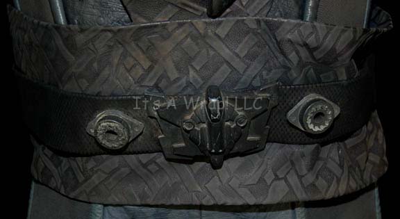 Description: A costume featured in various episodes of Star Trek: Deep Space Nine. This costume consists of a sleeveless, full-length, jumpsuit with the top half a black, spandex-like material, the bottom being neoprene over a gray fabric featuring a starburst pattern down the middle and stirrups for the feet; a distressed jacket matching the lower-half of the jumpsuit, faux suede around the collar, more gray neoprene and gray vinyl piping. A wide, dark-gray, rubber belt and bandolier with a textured design and featuring intricate resin accents that include a tricorder equivalent and a bank of ketracel white containers amongst others. Knee-high, black, rubber boots with the same design as the belt/bandolier and several sewn in tags denoting wear by several actors.
