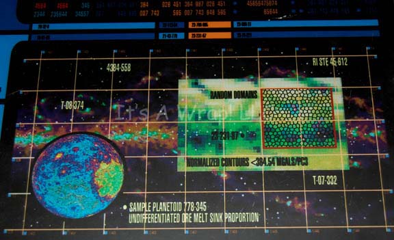 Description: A PADD (Personal Access Display Device) believed to be featured in Star Trek IX: Insurrection on the desk of “Captain Picard” (Patrick Stewart). The item is a plastic display backlight altered for screen use. The item is colored metallic pewter with metallic silver and gold colored adhesive accents, with wall hanging mount holes in the reverse, a power switch on the bottom painted gold, and a DC 12volt input jack on the right side. The item is untested as the AC adaptor for this item is unavailable, however, even unlit, the item’s translucent ‘display screen’ is still visible. The item is depicted as ‘Galactic Dilithium Supply 715’ and depicts an LCARS style display with a blue theme, multiple numeric values, a graphic of ‘Sample Planetoid 778-345’ as it is inscribed, and a close-up of ‘Random Domains’ all on a galactic background. The item measures approx. 13.75 X 11 X 0.75. The item is in every way undamaged, an excellent representative of this style of props, however, the ‘display graphic’ section of the item pulls away from the reverse section.