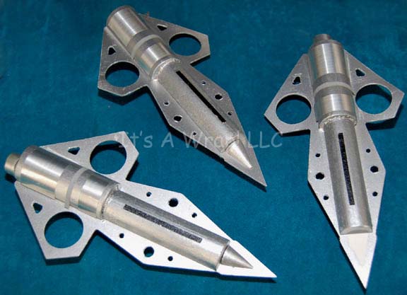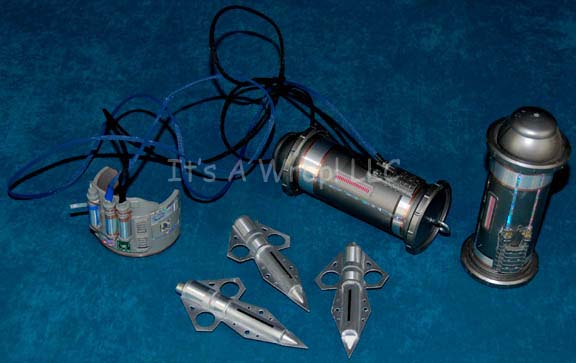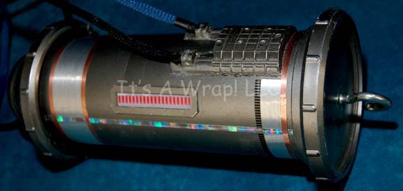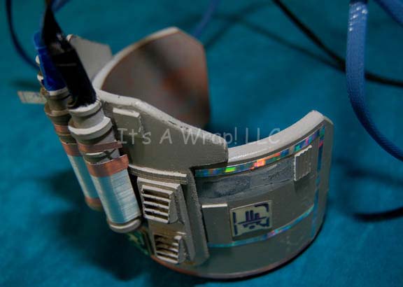 Description: A Lot of three Reman injection needles created for Star Trek X: Nemesis in the scene in which “Captain Picard” (Patrick Stewart) is transported aboard the “Scimitar” and held hostage by “Shinzon” (Tom Hardy). The items are metallic silver painted fashioned plastic and wood hand props with black adhesive detail lines. The items are also adorned with metallic silver colored adhesive accents and measure approx. 7 X 4 X 1.25 inches. The lot also contains a prop hanging intravenous fluid supply made from cast resin painted metallic pewter with metallic copper and silver colored adhesive accents, a hook to hang the item, connected to an arm cuff by blue and black colored rope. The cuff is similarly adorned but includes a miniature ‘display screen’ graphic adhered to it, and Reman style faux buttons. The supply also features an LED bank that blinks red in sequence, activated by a switch and powered by a 3volt CR 2032 sized battery. The item measures approx. 10.5 X 4 inches diameter, with the cuff measuring approx. 4.25 X 4.25 inches.