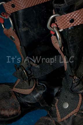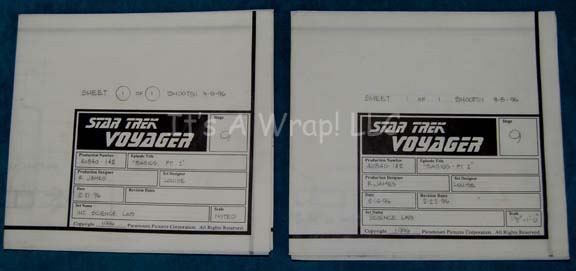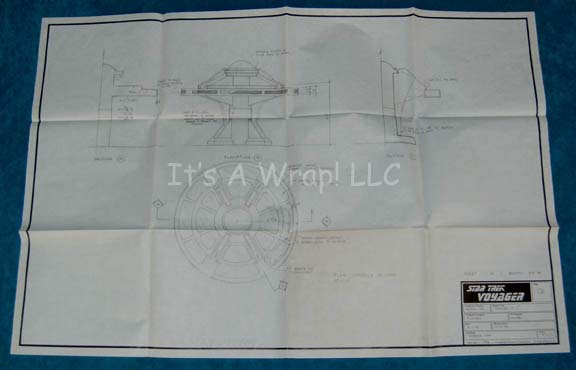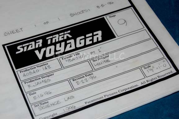 Description: A lot of a pair of boots and two schematic drawings from the first part of the Star Trek: Voyager episode “The Basics: Part I”; wherein the Kazon-Nistrim takes over Voyager sets her crew down on a desolate planet. The boots are for wear by Anthony DeLongis in the role of the first “Maje” of the Kazon-Nistrim, “Culluh”, black, leather, half-calf boots featuring various strips of suede, textured rubber, and diamond-shaped brown vinyl with metal ring accents. Included are two schematic drawings of the science lab featured in that episode. The schematics feature stage, production number, episode title, production and set designer, date, set name, scale, and copyright date.