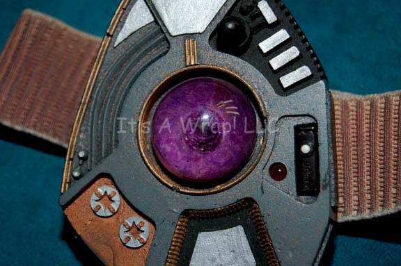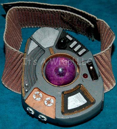 Description: A prop item featured in the Star Trek: The Next Generation episode “Higher Ground”; wherein “Dr. Crusher” is abducted by a terrorist group that wants to get the Federation involved in their “cause”. This item is roughly oval-shaped, resin cast in gray featuring a purple “jewel” or stone in the middle, black accents with silver and copper-colored, textured “circuitry” a white button that is believed to activate untested electronics, no back panel, and a worn, elastic band that secures via Velcro. The item measures approx. 4.5 X 3.5 X 6.5 inches.