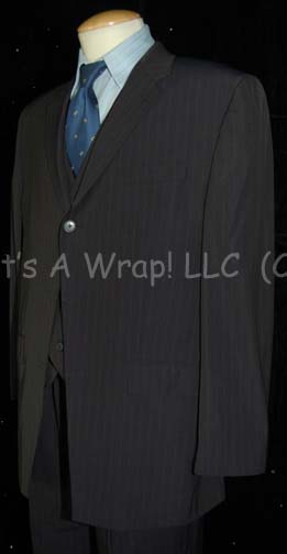 Description: A handsome three-piece dark blue pin stripe ‘DKNY’ name brand suit featured in the Star Trek: Enterprise episodes “Demons” and “Terra Prime” for wear by veteran science fiction actor Peter Weller in his portrayal of “John Frederick Paxton”, the leader of the xenophobic extremist group “Terra Prime”. The costume was assembled by quality suit maker ‘Academy Award of Los Angeles’ and comes complete with a blue herringbone dress shirt, cufflinks, a 100% silk blue tie, leather belt and black leather ‘Alfani’ name brand shoes. The garments, including the tie, feature sewn on Enterprise tags reading ‘Peter Weller’ except for the jacket, the shoes feature no specific tag. The costumer’s tag reads ‘Enterprise, Paxton & stunt dbl., Peter Weller’ and indicates the components. The stunt version of the costume is not present.
