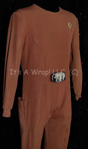 Description: A brown colored Starfleet Class-D uniform jumpsuit featured in Star Trek I: The Motion Picture. The costume is a form fitting brown jumpsuit with a sewn on yellow backed Starfleet emblem indicating the wearer to be part of the operations division, an affixed bio-monitor, and comes with two unattached yellow division strips for the shoulders. The shoulders of the costume feature remaining threads from removed items. The costume is intended for male wearers and a costumer’s tag reads ‘Greg Mace’.