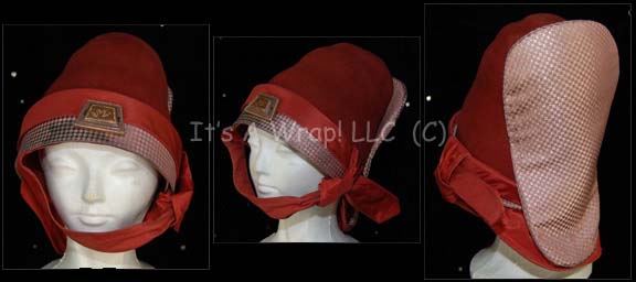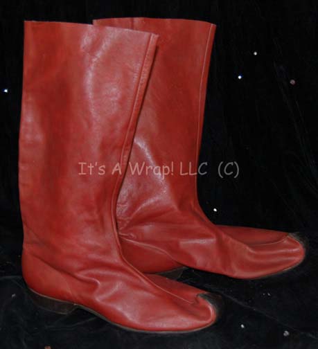 Description: A Vulcan costume featured in Star Trek VI: The Undiscovered Country. The costume is a set of beige trousers with a waist tie and cropped shin cuffs, a matching shirt with kimono style sleeves and a gold patterned yoke, a rust colored tabard with gold trim and an oversized affixed Vulcan ‘gem’ with gold painted iconography. The costume comes with a matching red felt hat with a pink checkerboard backing and trim, and a similar Vulcan ‘gem’ at the forehead, a pair of rust colored leather boots with upturned gold painted toes, and a blue colored Khitomer attendee sash indicating the wearer to be part of the Federation contingent that is tied off at the bottom and faded to purple in places.