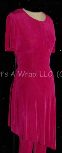Description: A costume featured in the Star Trek: Voyager episode “Non-Sequitar”; wherein “Harry Kim” (Garrett Wang) wakes up one morning back in San Francisco and had apparently never been assigned to “Voyager”. This costume is a short-sleeved, dark-pink, Lycra dress featuring an irregular hem, sewn in, matching leggings with feet, a zip down the front and corresponding, magenta pumps. This dress was also featured in the wedding scene of Star Trek: Nemesis as worn by one of the guests. A sewn in Deep Space Nine tag reads ‘Audry Baraishyn’, a costumer’s tag reads ‘Jennifer Gatti, Libby, #122’, and a second costumer’s tag reads ‘Dancer, Audrey Baraishyn, Star Trek: Nemesis, Scene 9-10’.