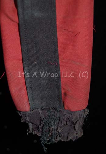 Description: A distressed crewman’s uniform believed to have been featured in the Interplay video game “Starfleet Academy” for wear by Julianna Robinson in her portrayal of “Vanda M'Giia”. The costume is a feature style crewman’s uniform jumpsuit with these attached elements, a pair of operations gray division strips on the shoulders, and four silver colored metal commendation bars placed on the right neck of the black ribbed collar. The costume also comes with these unattached items, a pair of black shoes with Starfleet emblem logos affixed, a division strip for the left sleeve forearm, a red placement with a silver colored rank badge indicating the wearer to be an ‘able seaman’, and a metallic silver pin backed badge with the name ‘CARSON’ etched into it. The costume is distressed in that the left sleeve cuff is thrashed and the right sleeve cuff is ‘melted’, and the costume fabric is generally dulled to appear ‘scorched’. The shoes are fragile due to time and storage conditions, they have become tough and brittle.