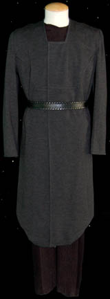 Description: A lot of a costume and several costume items similar to those featured in various episodes of Star Trek: Deep Space Nine but more specifically in the later seasons. The lot includes a “First Contact-style” Starfleet uniform, called this because it was first used in the feature film of the same name and went on to be the standard; it is a long-sleeved, black uniform jacket featuring blue-gray, quilted shoulders, a Velcro patch for a commbadge (not included), Sciences Blue division colors around the cuff, five matching Sciences Blue, long-sleeved undershirts, and black uniform trousers with hoops at the waist for tools; a metallic rust-colored sash decorated in reds and olive color geometric shapes believed to have been worn during the wedding scene of “Commander Worf” (Michael Dorn) and “Jadzia Dax” (Terry Farrell). All items except that sash include sewn in tags that read ‘Deep Space Nine, Alexander Siddig’, and several costumer’s tags read the same. Please note, pants have a small hole thats barely visible.