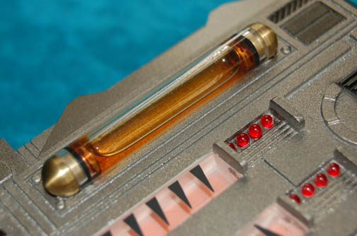 Description: A high quality cast resin ‘alien bomb’ prop featured in the Star Trek: Enterprise episode “Vanishing Point” in which “Hoshi Sato” (Linda Park) begins to phase out of existence due to a transporter malfunction and ends up being able to walk through walls. She discovers a pair of aliens who are planting bombs in various places on “Enterprise” and attempts to alert the crew. This prop bomb features symmetric details mirroring each other in that both sides have clear elements, light banks, a brass capped transparent tubes with amber colored fluid in them, black wires, and are painted metallic pewter. The reverse features a placement for a telephone wire connection. The item measures approx. 6.5 X 6.25 X 1.5 inches.