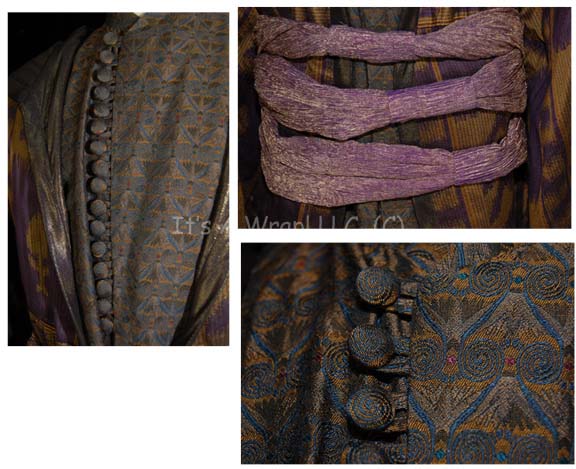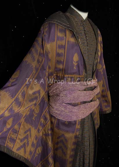 Description: A costume similar to those featured in various episodes of Star Trek: Enterprise. This costume consists of a long-sleeved, full-length gray/brown under robe featuring an intricate design of orange accents and a blue swirl pattern, matching buttons half way down the front and along the cuffs; small hidden buttons the rest of the way down, and a metallic-purple and gold belt with textured, horizontal, bunched appearance. Included is a long-sleeved, full-length, kimono-style purple and dark-gold colored over robe featuring staggered stripes and iconographic symbols, oversized, bell-sleeves, and a metallic-gold lining that buttons onto the shoulders of the under robe. A sewn in Enterprise tag on the under robe reads ‘Anthony Acker’, a sewn in Enterprise tag on the over robe reads ‘Louis Ortiz’, and a sewn in tag on the over robe reads ‘Anthony Acker’ as well but has an “X” written through the name.