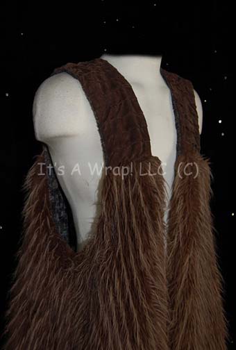 Description: A costume similar to those featured in various episodes of Star Trek: Enterprise involving Klingons. This costume is a sleeveless, full length robe featuring long, brown, faux fur attached to black, suede, pleated overall-style straps with a black tie around the front and black/gray/white inner lining. The costume is labeled ‘Louis Ortiz’ and has a costumer’s tag that reads ‘Enterprise, Klingon, Louis Ortiz’.