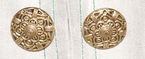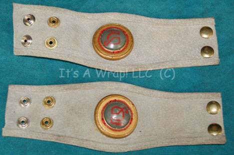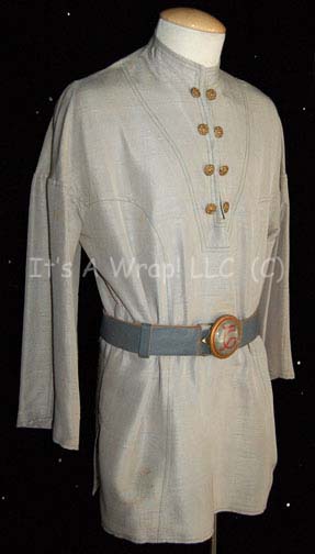 Description: A costume featured in the opening sequences of the fourth Star Trek feature film, “The Voyage Home”. This costume is that of one of the Vulcan technicians who were repairing “Kirk” (William Shatner) and crew’s “commandeered” Bird of Prey before their attempted return to Earth; a long sleeved shirt with a deep open chest that clasps in spite of a number of buttons, a pair of leather bracelets with round resin ‘gems' on them that feature painted Vulcan iconographic symbols, and a leather belt with a similar ‘gem’ that was glued to a silver colored metal Starfleet emblem buckle. A plum colored, felt hat is also included, featuring a black and rust-colored sash around the base that becomes a chin strap, and a plastic “jewel” in the middle with Vulcan iconography. Unfortunately, the costume does not include the trousers.