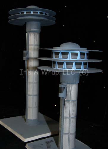 Description: A pair of matching building models created for Star Trek episodic television to represent buildings on a skyline. The items are mounted on foam square-shaped bases with plastic tubes running up to create a pedestal, and three metal rings representing the actual structure of the buildings. A variety of graphical applications representing windows and detail are applied to the items and both feature an ‘elevator’ positioned on the pedestal at differing heights. The items are painted light blue and measure approx. 8 X 7 X 14.25 inches and 8.75 X 9.5 X 21 inches. The circular structures at the top have come off their pedestals but are included and the graphical applications have lost a degree of their adhesive quality, yet the overall aesthetic of the items is still present and viable.