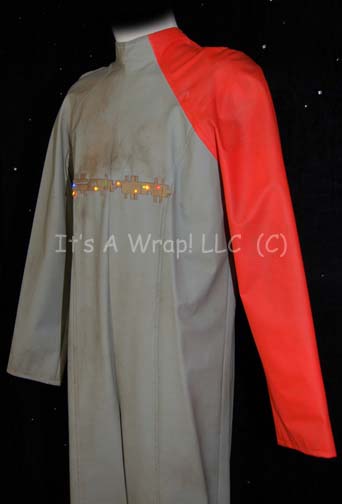 Description: A The U.S.S. Voyager's first encounter with the Nygean species was in the Star Trek: Voyager episode “Repentance” in which the Voyager rescued one of their prison ships and passengers. This costume was worn by a Nygean prisoner and includes a sage green vinyl jumpsuit with an orange left sleeve and a zip up the back. Across the chest is a geometric rubber panel with built in LED lights of various colors. They are activated by a standard 9volt battery worn on a belt under the suit. The costume is lightly distressed in the form of stains across the surface of the chest. A sewn in tag reads ‘Steve Hudis’ and the costumer’s tag reads ‘#259 Repentance, Prisoner Stunt Dbl (For Louis Ortiz), Steve Hudis’.