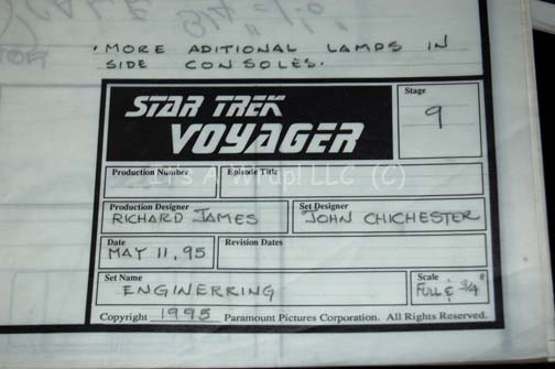 Description: A lot of schematics for sets created for the Star Trek: Voyager pilot episode “Caretaker” and for things added later in the first season. This lot consists of five engineering interior schematics for additions and sets that were added during the first season and one that reads simply “Interior Enclave” and is labeled as “Pilot”. Items include information like show name, stage, production number, original date, set name, production and set designer, and scale on a panel in the lower right hand corner.