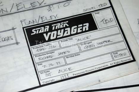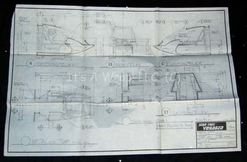 Description: A lot of schematics of the interior and exterior of the shuttle “Tom Paris” (Robert Duncan McNeill) names “Alice” in the Star Trek: Voyager episode of the same name. This lot consists of four external and three internal views of various parts of the ship. The items feature information like show name, stage, production number, original date, set name, production and set designer, and scale on a panel in the lower right hand corner.