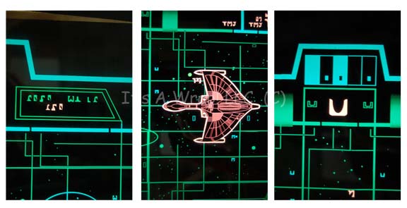 Description: A Romulan themed computer display panel featured in the Star Trek: Deep Space Nine episode “The Die is Cast” during scenes in which “Garak” (Andrew Robinson) and “Odo” (Rene Auberjonois) escape the Romulan flagship in the joint Tal Shiar – Obsidian Order during the battle of the Omarion Nebula. The item is a large trapezoid shaped sheet of smoked acrylic with a graphical application adhered to the reverse that is visible when back lit by an external light source. The display graphic depicts the position of a Romulan Warbird relative to three round points of interest on a map. The display is represented in the Romulan style with a blue and green theme, features Romulan character letters, and multiple static readouts. The acrylic features screw holes for for wall or console mounting. The item measures approx. 25.75 X 49 inches on the long end, 47 inches on the shorter top side. The remains of an adhesive sticker are present on the face of the item.