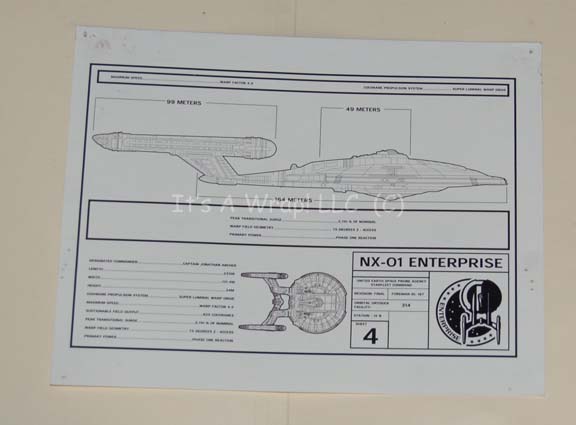 Description: A set dressing item appearing in various episodes of Star Trek: Enterprise in the crew quarters set of “Commander ‘Trip’ Tucker” (Connor Trinneer). The lot is a pair of polished silver colored metal covered bulletin boards with the ‘paperwork’ that was pinned on them. The paperwork is comprised of items that were located with the bulletin boards and verified in set continuity guides. One board is adorned with a translucent sheet that features a schematic of circuitry in black and hand written marker strokes in red and white, an ‘ENGIN/MAINT’ schematic on photo quality paper and a ‘DEPT STATUS’ log report indicating the title of various departments on the ship. The second set of ‘printouts’ are comprised of an ‘OPS DUTY ASSGN’ sheet and an ‘ACTIVITY REPORT’, a printout reading ‘INPUT MODE’ that features a schematic, a ‘HULL INTEGRITY REPORT’ that features a dorsal schematic of the “Enterprise NX-01”, a circuit design schematic, and a printout of the ‘Battle of New Orleans’ on paper taken from an etching with a lively depiction of American troops battling the British from a set of earthworks. Another set of 8.5 X 11 inch items are present which were not depicted in the continuity guides comprised of a printout of a star chart in black with radiating positions showing the location of stars in the galaxy and of some well known locations including ‘Wolf-359’, ‘P’Jem’, ‘Terra Nova’, ‘Andoria’ and ‘Vulcan’; a translucent rendering of what may be a nacelle housing, an ‘ENGIN/ MAINT’ report deck by deck, and an engineering schematic of the “Enterprise NX-01” complete with a graphic of the assignment logo for the ship, and capabilities of the ship itself under normal operating parameters. The paperwork features pin holes and a degree of warping and bends due to set use, they were located in a folder reading ‘Trips Quarters’. The bulletin boards measure approx. 15 X 21 X 0.75 inches with screw holes for wall mounting.