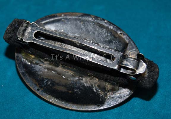 Description: A character costume accessory like the ones appearing in multiple episodes of Star Trek: Deep Space Nine like “Playing God” and “Blood Oath” for use by Terry Farrell in her portrayal of “Jadzia Dax”. The item is a hair barrette made from gold colored metal which has been painted down to reduce reflectivity in camera work. The item features a painted in black ‘gem’ centered on the item and is worn horizontally as opposed to vertically mounted similar items. The barrette is hot glued on to the metal and the item measures approx. 3.25 X 1.25 X 2.25 inches.