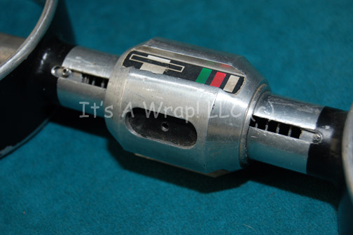 Description: A set of silver colored metal manacles featured in the Star Trek: Deep Space Nine episode “Inquisition” during scenes in which “Dr. Bashir” (Alexander Siddig) was taken to the security office. The item is two metal rings affixed to a centered post that features a pair of spring loaded restraints mounted within the post. The restraints push out into a position that keeps the wearer’s wrists in place, but are easily removed due to the lightness of the springs. The manacles measure approx. 12 X 4 X 1.5 inches and feature multi-colored applications, foam padding for ease of wear, and a slight degree of rubbing on the centered post.