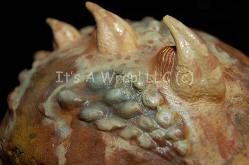 Description: An alien special effects make-up mask believed to have been featured in the Star Trek: Enterprise episode “Rajiin” and altered for later use. The mask consists of a full head wrap and a removable face application with cut out eyes and mouth. The mask has large ears and horns believed to have been added on for later use and painted to match. The lifelike alien flesh tone is brown and tan themed, the mask itself is soft and flexible. Only around the edges is there any evidence of drying or cracking. One horn for the forehead of the mask is separate but accompanying.