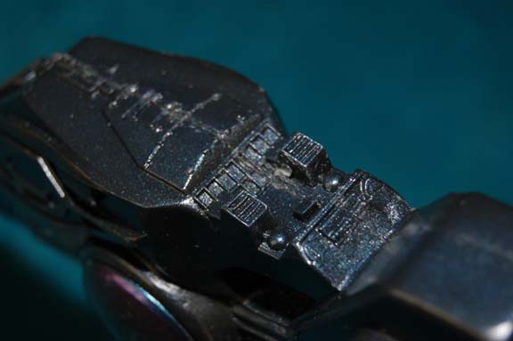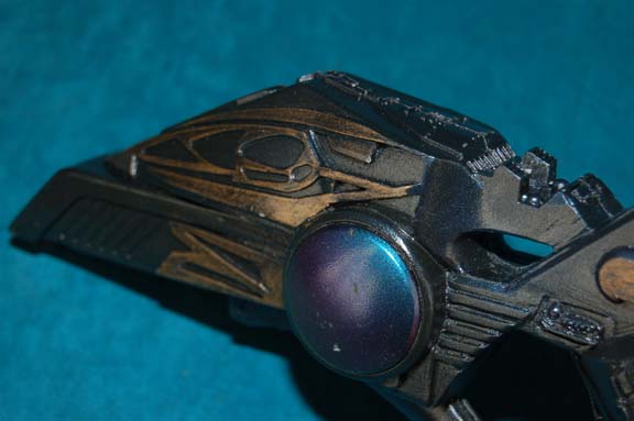 Description: A solid high quality cast resin Hirogen energy pistol created for use in various episodes of Star Trek: Voyager. The item is painted iridescent pewter with gold and purple colored accents. The item features multiple points of molded detail to suggest technology. The purple painted circle in the center of the item changes to a blue color depending on upon which direction you hold it. The item measures approx. 11X 6 X 2 inches and is the only one that has been located this far.