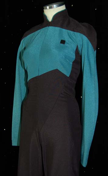 Description: A costume featured in various episodes of Star Trek: The Next Generation. This costume is a TNG-style Starfleet uniform consisting of a long-sleeved, full-length black jumpsuit featuring Sciences Blue division colors along the chest, back, both sleeves, and as piping around the collar; a Velcro patch for a commbadge (not included), zip up the back, and clasps at the neck. The Sciences Blue coloring has sustained the most minor of fading, if any. A sewn in tag reads ’35 June Jones 108’ and the costumer’s tag states the same. Item Number 6967