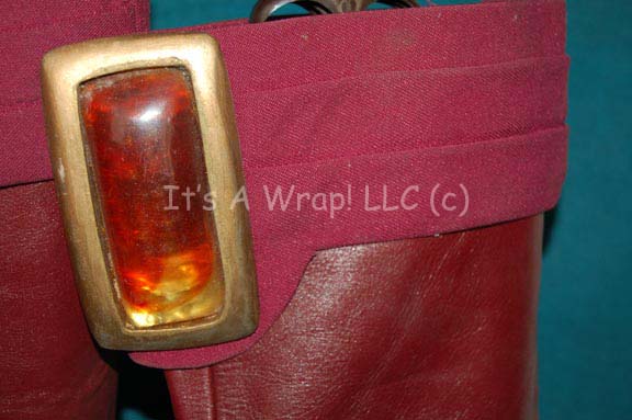 Description: A pair of plum colored Vulcan themed boots believed to have appeared in Star Trek III: The Search for Spock. The boots are of similar design to the costumes of the ceremonial guards in the Fal-Tor-Pan sequence and feature large sewn on ‘gem’ stone accents made from translucent resin on the front of the shin just under the knee. The boots feature gold colored upturned toes and are made for male wearers as size 11.5.