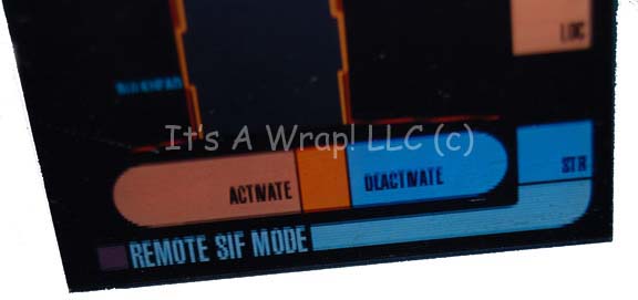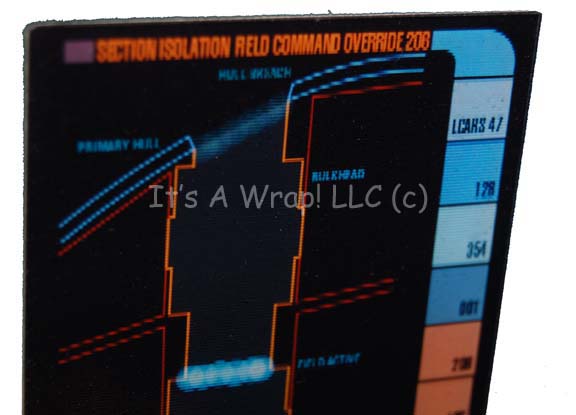 Description: A display graphic for a tricorder created for Star Trek X: Nemesis during the scene in which “Data” (Brent Spiner) leaps from the “USS Enterprise-E” and “Geordi LaForge” (LeVar Burton) disables a force field to allow him to do so. The item depicts the location of a pair of force fields keeping the atmosphere of the “Enterprise” held within and is inscribed ‘Section Isolation Field Command Override 208’ in the LCARS style (Library Computer Access and Retrieval System). While the tricorder used in the movie is believed to have utilized a computer generated graphic, this item may have been created as a possible alternative. The item measures approx. 3.5 X 2.75 inches and moving the item generates the optical illusion that the outer hull force field deactivates.