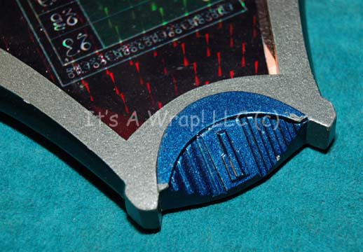 Description: A prop Orion themed PADD (Personal Access Display Device) featured in the Star Trek: Enterprise episode “Borderland”. The item is high quality cast resin painted metallic pewter with iridescent blue accents and clear gel squares applied to the reverse (these accents are peeling off at their corners). The display graphic is a reflective Orion themed application. Underneath is a Talaxian themed application. The item measures approx. 6.5 X 5 X 0.5 inches. Only the slightest of dings or scratches are evident in the item’s paint.
