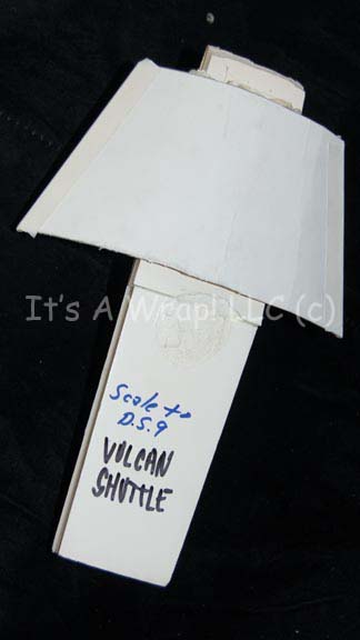 Description: A foam core test model created for Star Trek episodic television. The item is a Vulcan cruiser titled the ‘T’Pau Type’. It features card board warp nacelles configured in the traditional Vulcan fashion. The item is inscribed ‘Scale to D.S.9. Vulcan Shuttle’ and depicts a degree of damage where adhesive has failed on one side of the nacelle and where a mounting bar has been removed. The item was created to use in camera tests prior to filming the actual special effects model shot. The item measures approx. 7 X 3 X 10 inches.