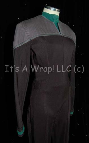 Description: A Starfleet uniform jumpsuit featured in multiple episodes of Star Trek: Deep Space Nine for wear by Terry Farrell in her performance as “Jadzia Dax”. The costume is a black form fitting jumpsuit with gray quilted shoulders and sciences blue division strips on the sleeve cuffs, with ‘away team’ gear loops sewn into the waist, and a sleeveless blue sciences division undershirt with a zip front and negligee. Both garments feature sewn in Deep Space Nine tags reading ‘Terry Farrell’ and the costumer’s tags read ‘DS9 Dax’, one reads ‘Terry Farrell’ and is stamped ‘DS9’.
