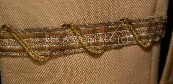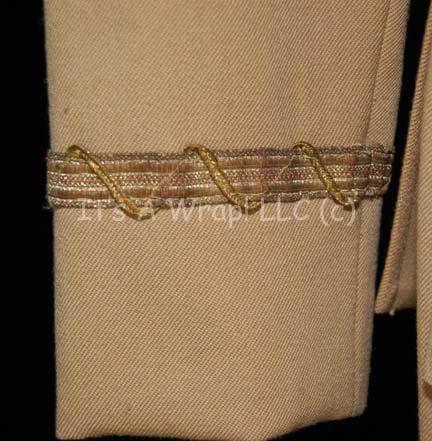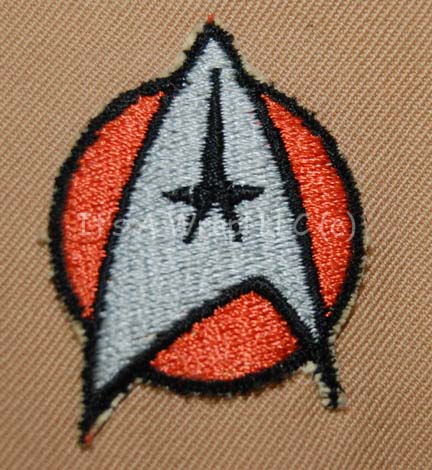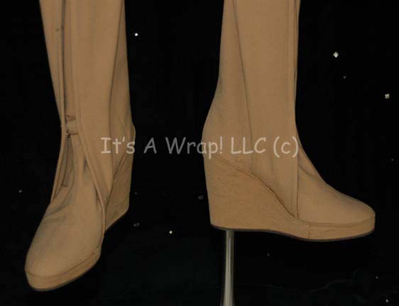 Description: A costume featured in the first Star Trek feature film. This costume is a tan, Class-D Starfleet uniform jacket featuring a sewn on Starfleet emblem with orange backing denoting the wearer to be part of the Sciences division, affixed bio-monitor at the waist, sewn on lieutenant braids on the cuff, a zip up the back and clasps at the neck; matching overall-style trousers, and sewn on heeled shoes. An original, handwritten costumer’s tag reads ‘Star Trek, Iva Hane (Lieut. Tech), Change #1 sc. 64, ent bridge, sc. 97 ent bridge’.