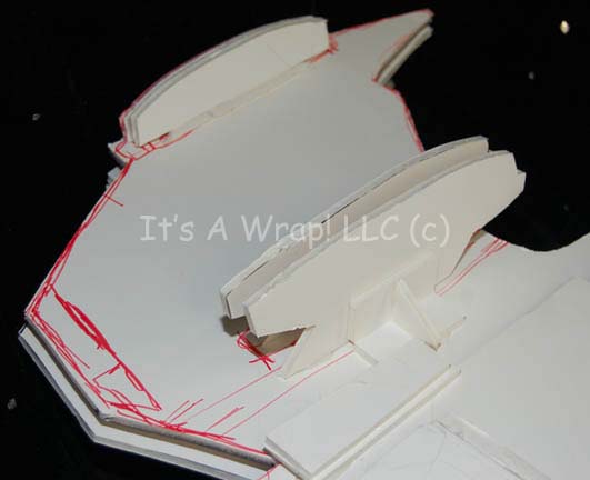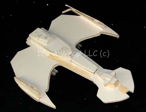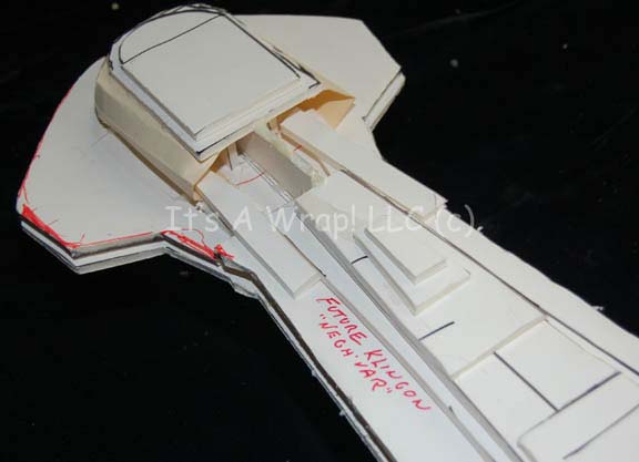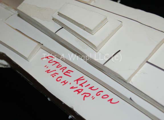 Description: A white foam core test model of a Klingon Negh’Var class starship created for the Star Trek: The Next Generation Episode “All Good Things…” The item is made form multiple layers of adhered together foam core cut to specific shapes for camera tests and scale representations of flyby sequences. The item features a damaged area on the dorsal center where a mounting arm was removed, and red marker lines on the ventral side for cutting the item into shape. The item is inscribed ‘Future Klingon “Negh’Var”’. Due to time and storage conditions the item has seen a visible degree of wear and moderate damage. Some elements are completely broken off, yet the item retains its overall resemblance to the intended starship. Measures approx. 24 X 29.5 X 7 inches.